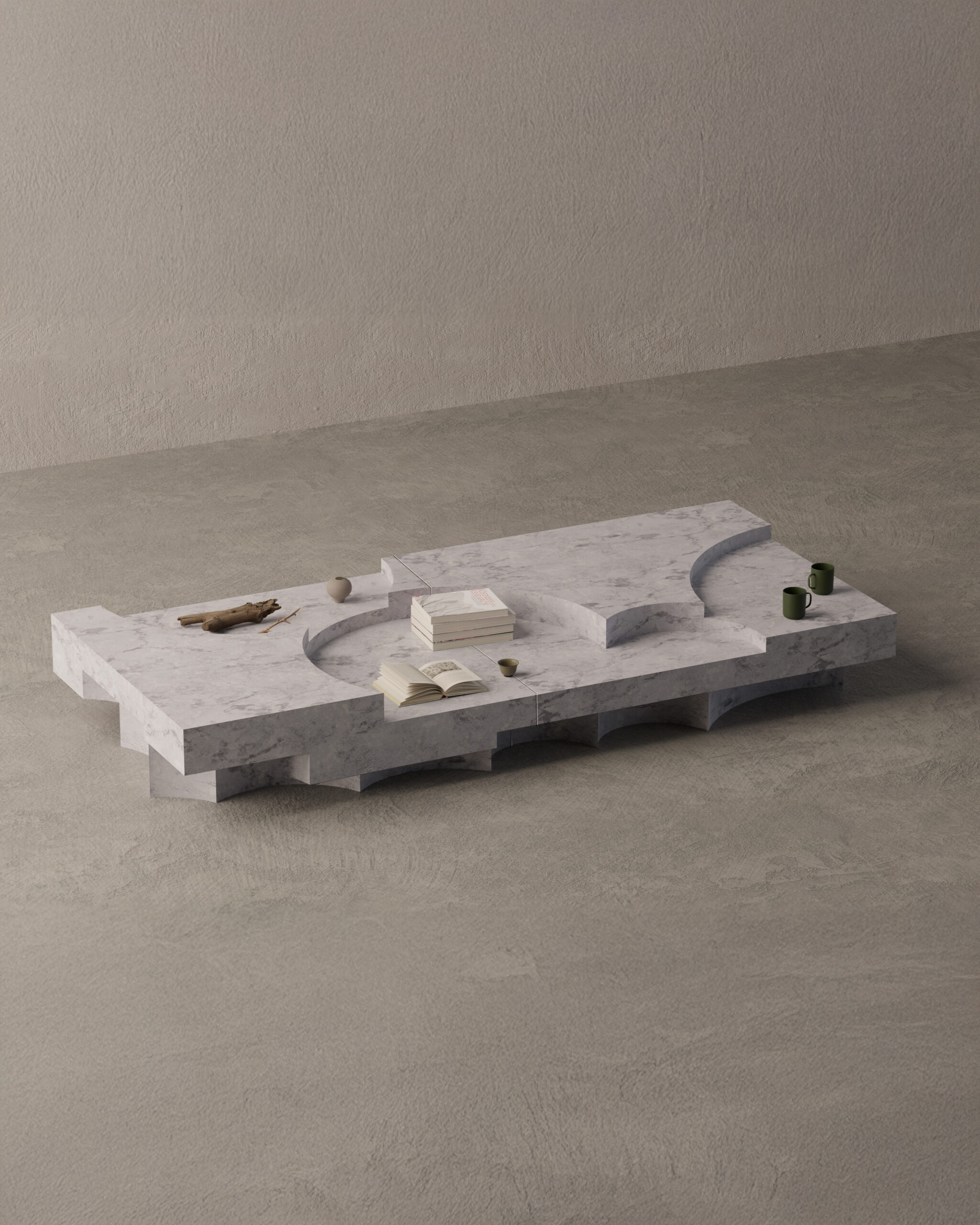 Just like an altar, EWE x TACCHINI new side table offers a place for awe, praise, and treasuring daily objects in the home. The process of sculpting the shape is based on obsessive and precise drilling of the stone volumes, which is crucial to achieving both the visual and functional stability of the piece.