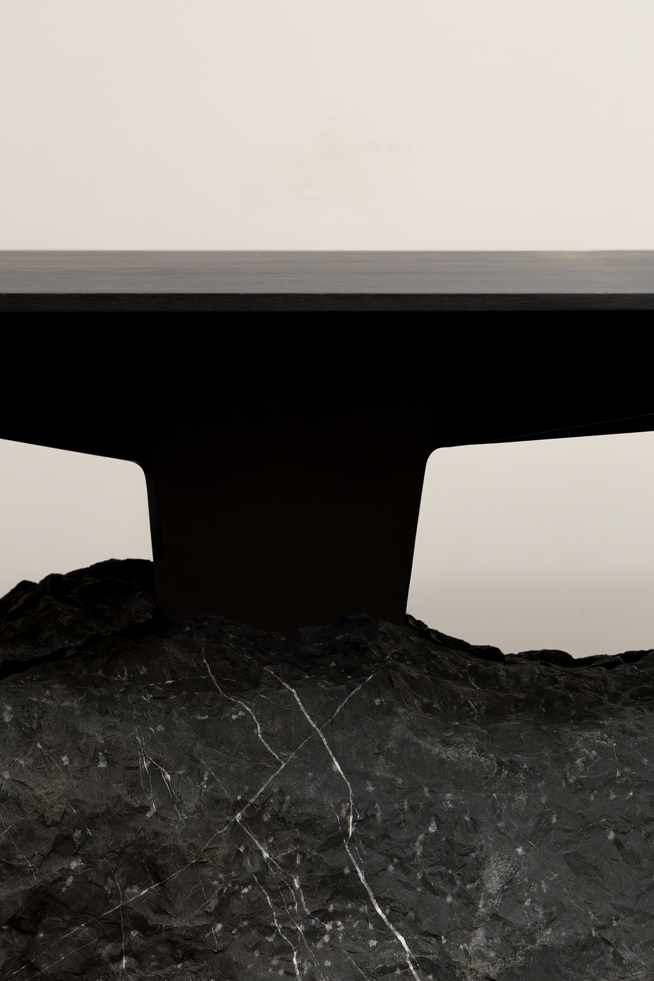 The Humo table, part of the Alquimia collection, draws inspiration from natural phenomena such as fire and volcanoes, combining a single block of quarry-sourced marble with a steel structure and a wooden countertop. Its burnt surface captures the transformative essence of fire, revealing the raw beauty of its materials.
