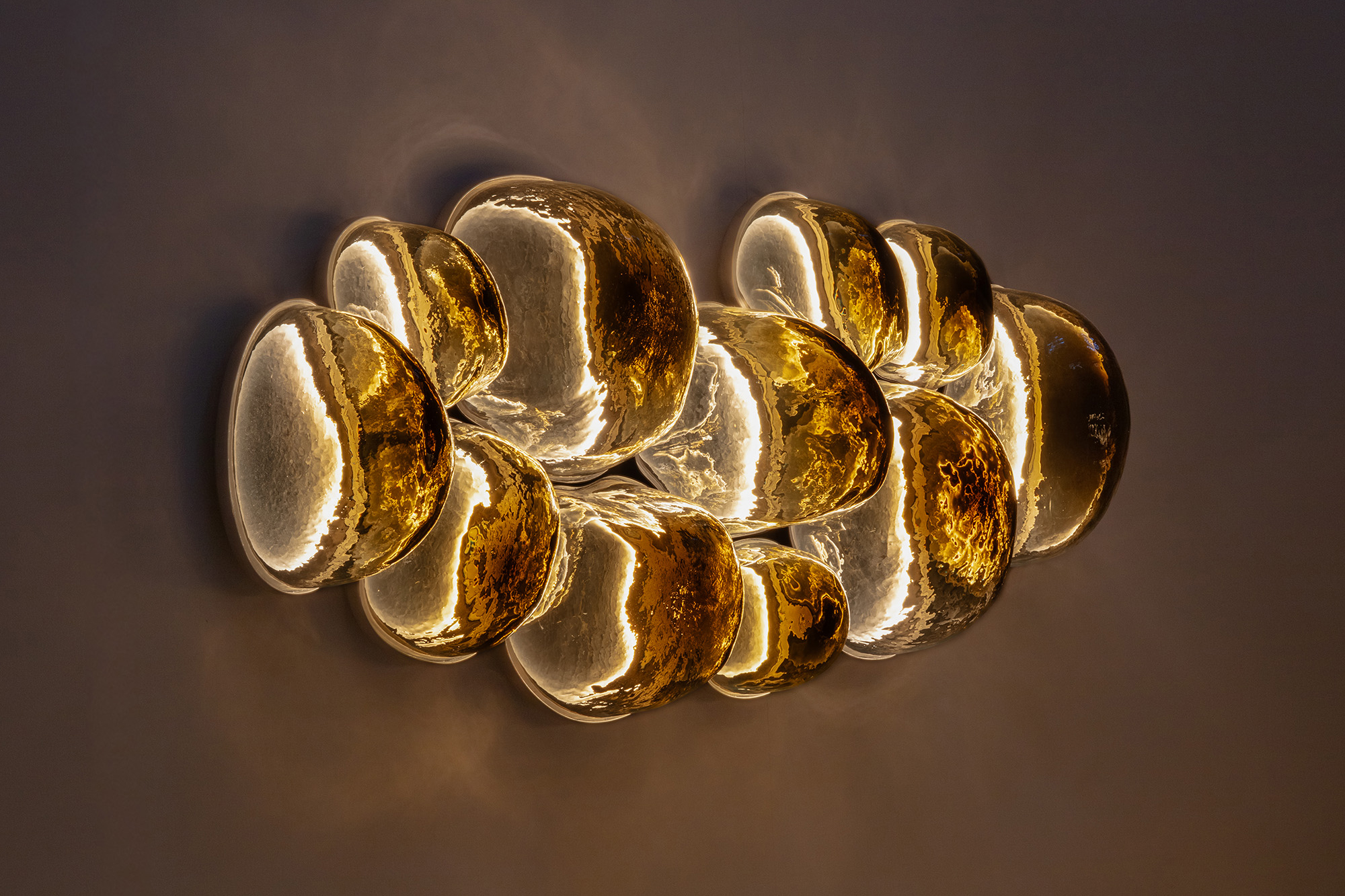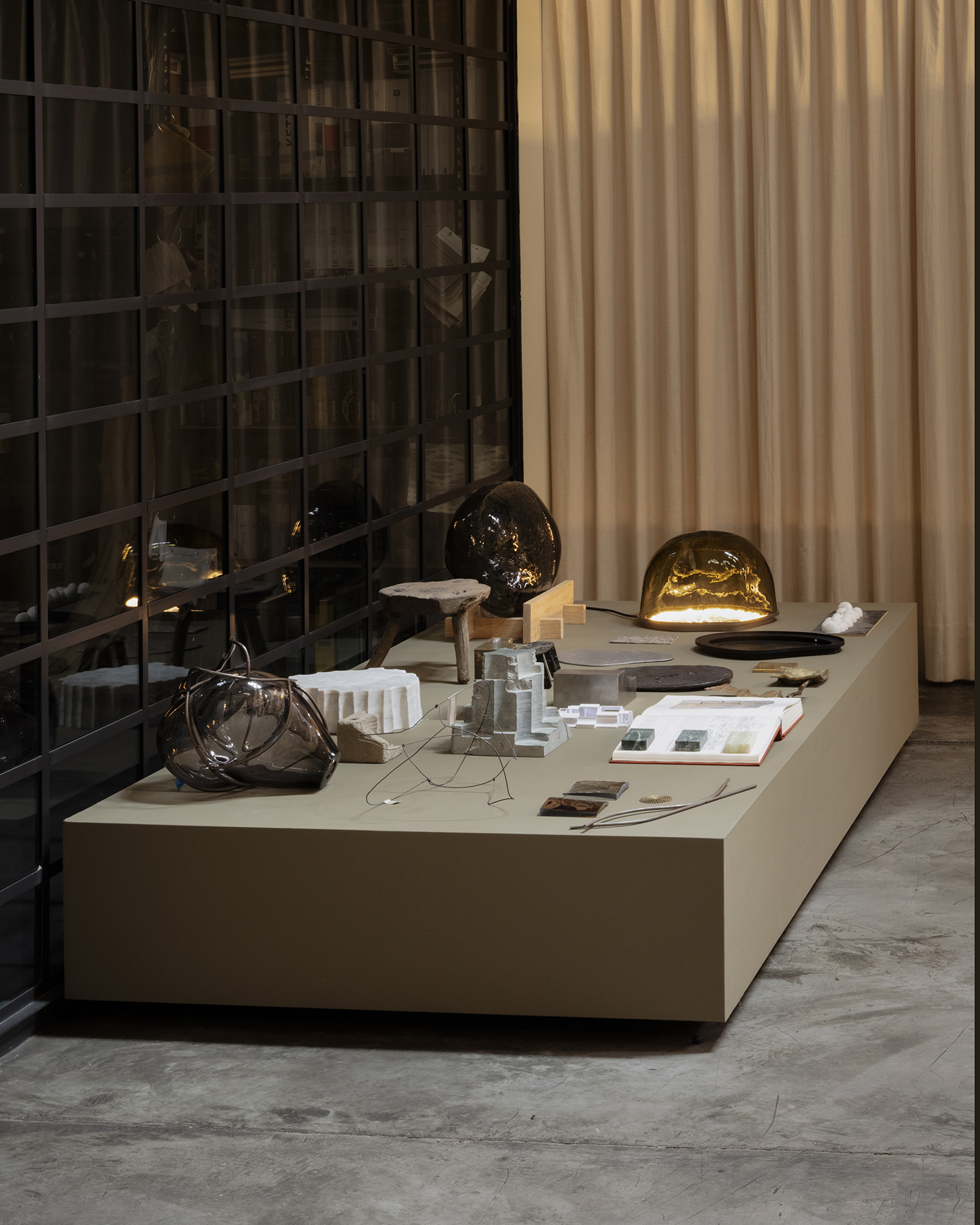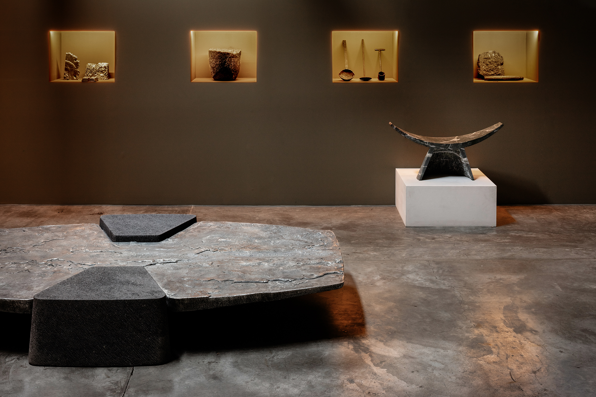 La presentación incluyó el Símbolo Short en ónix verde junto con su iteración más reciente, la mesa auxiliar Símbolo en ónix ámbar; dos de nuestros icónicos bancos Memoria; una mesa de centro de nuestra colección más reciente, Exhuma; y un banco Partera elaborado en mármol verde Tikal, que dialogó con nuestras incorporaciones más recientes, las Magmas verdes.