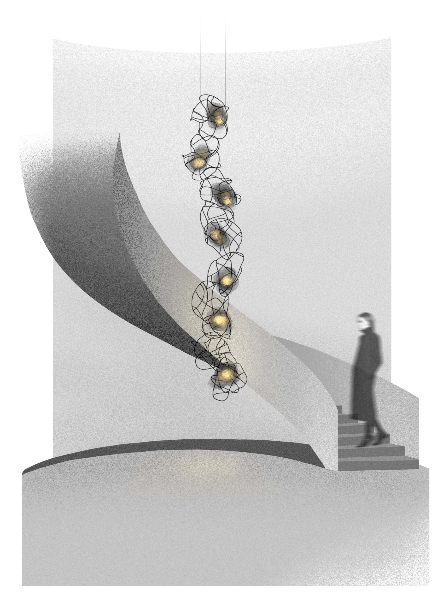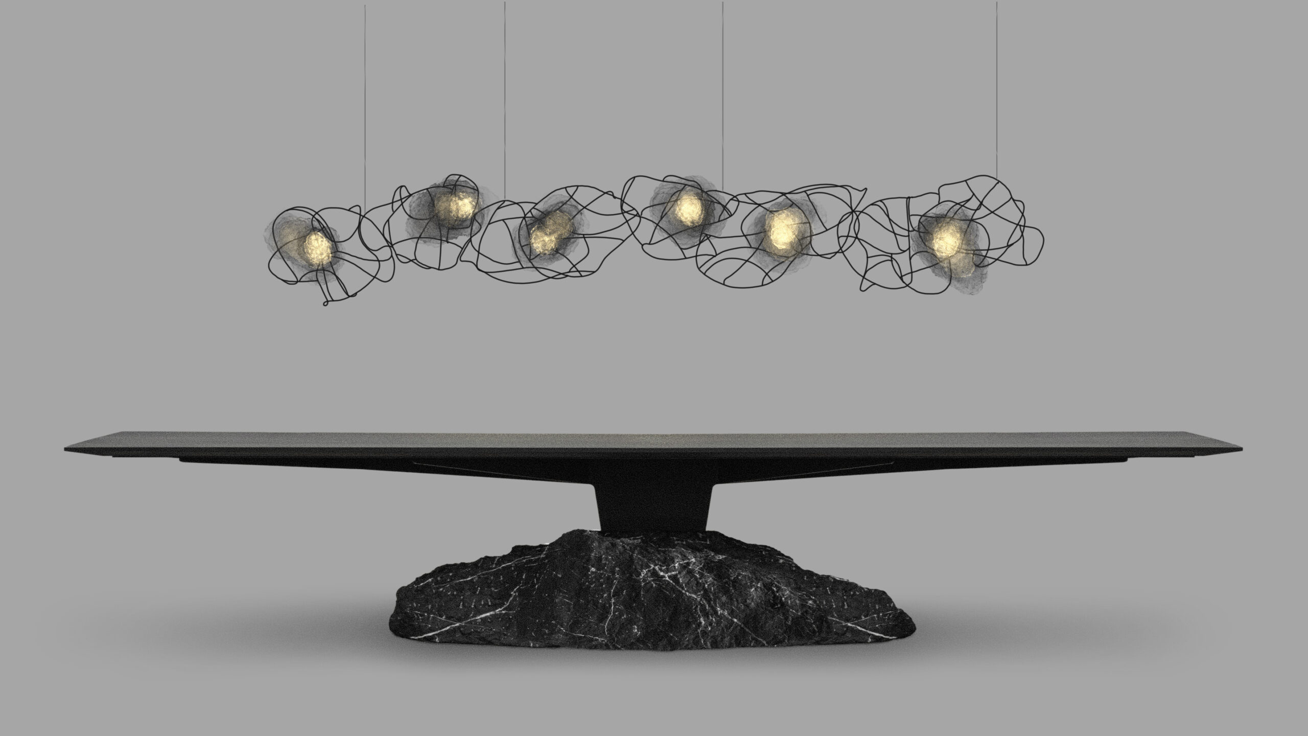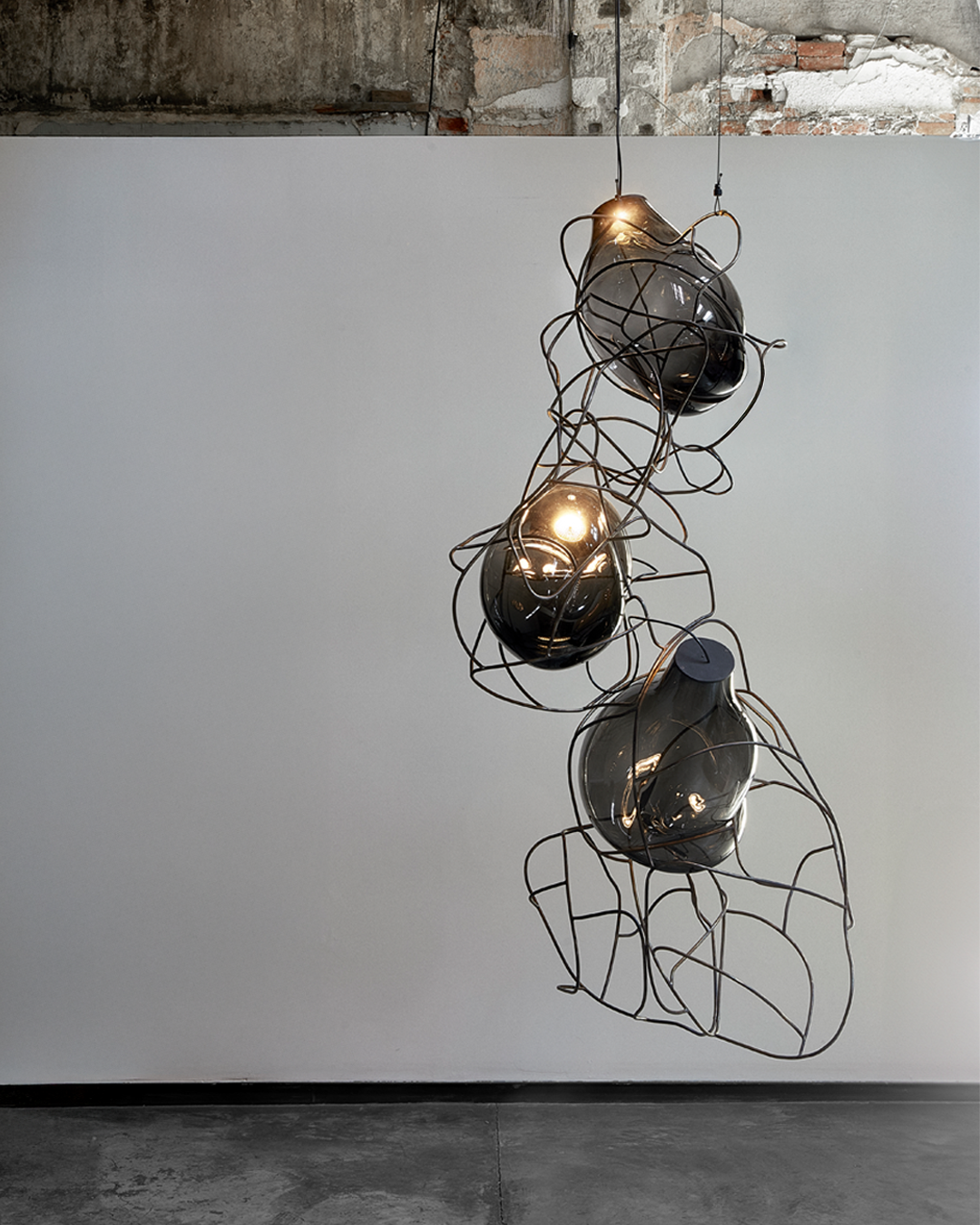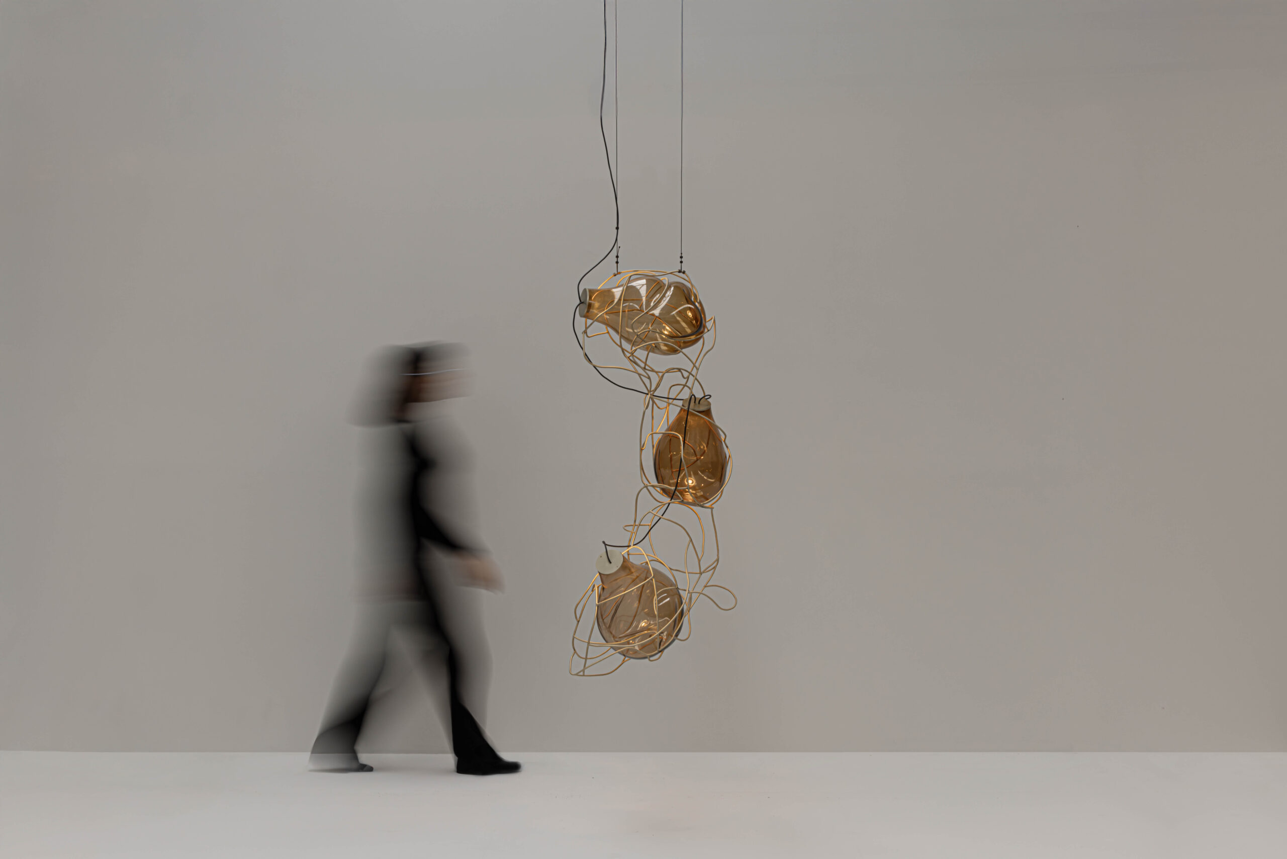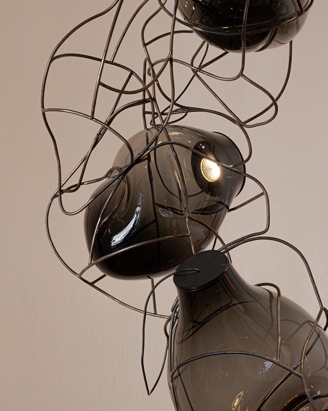 Cúmulo es la primera escultura lumínica tipo candelabro de EWE Studio, una pieza inspirada en las formaciones de nubes. Al igual que su símil de la colección Nebula —burbujas individuales de vidrio que evocan materia cósmica— fusiona vidrio y metal en una sola estructura flotante, desafiando tanto el equilibrio visual como el espacial.