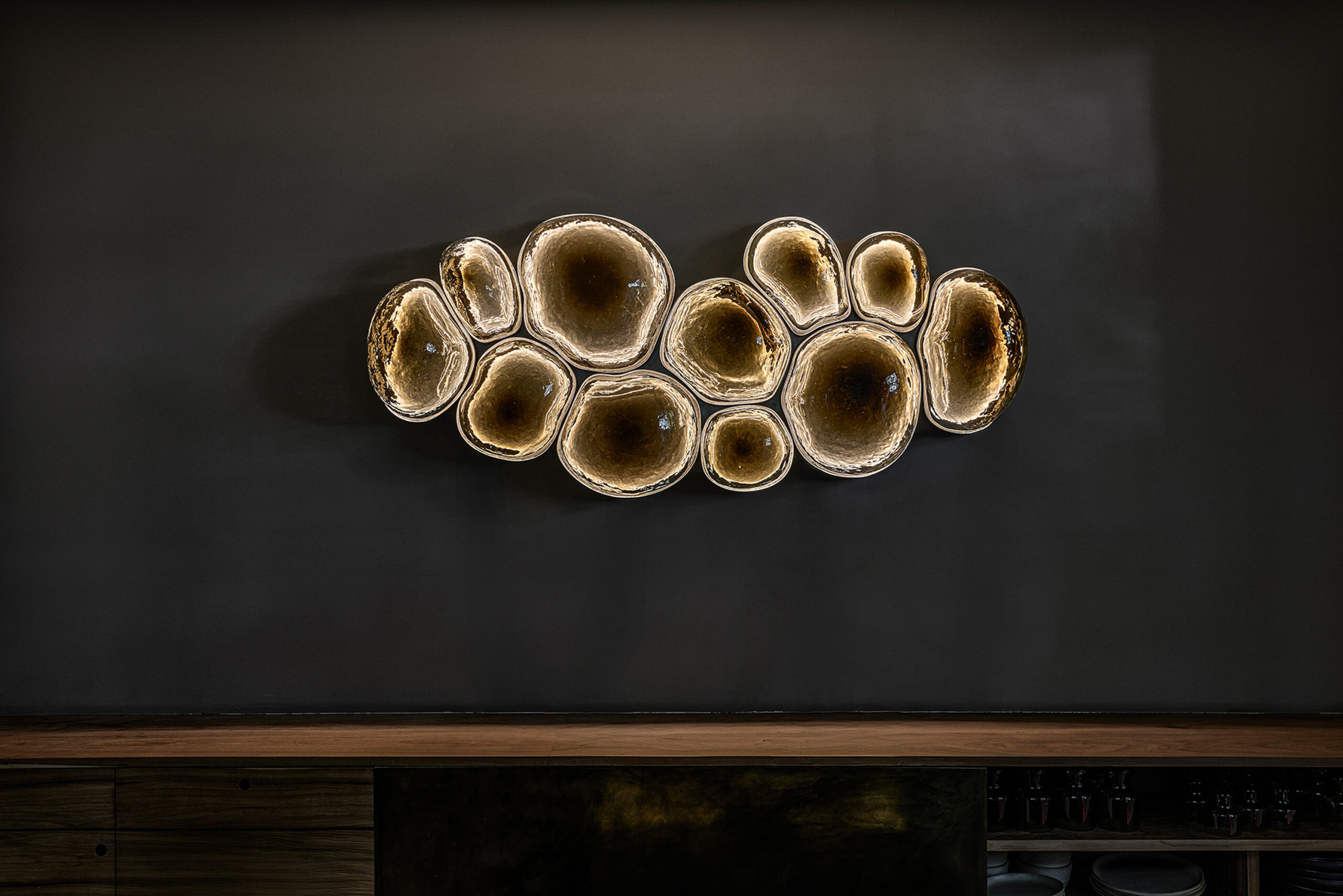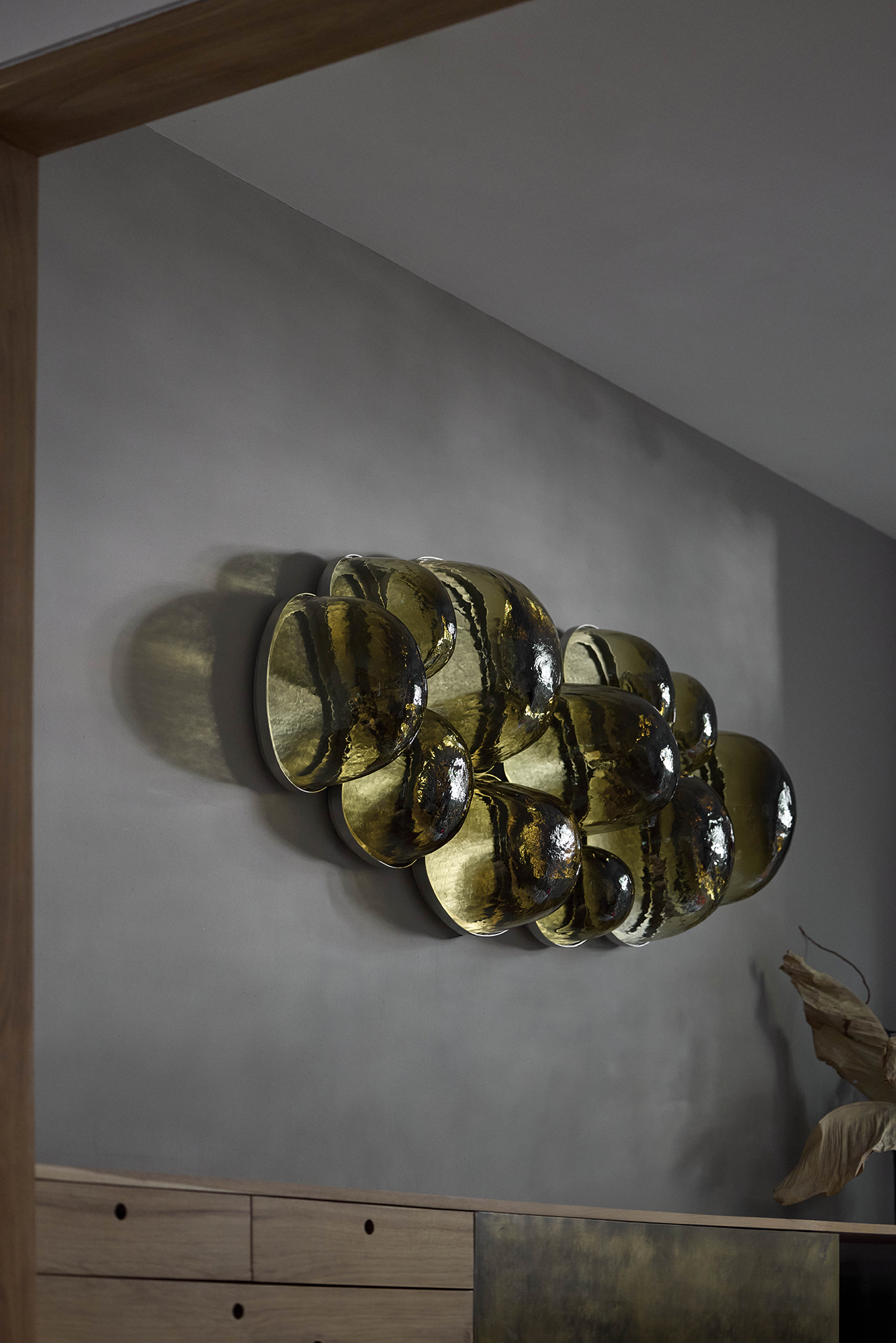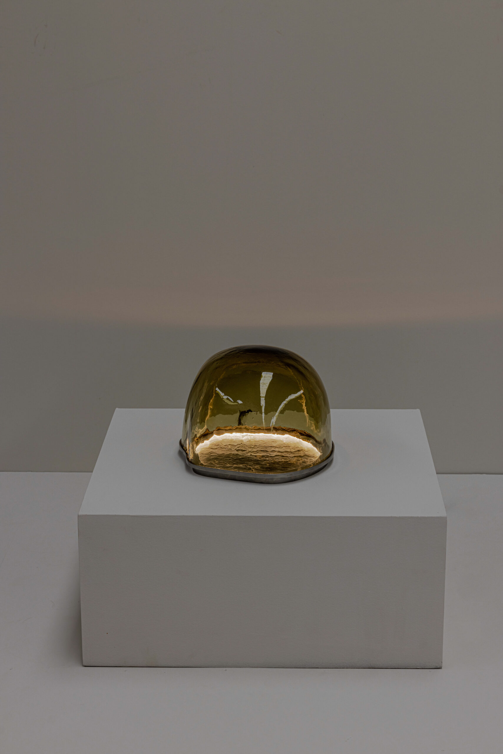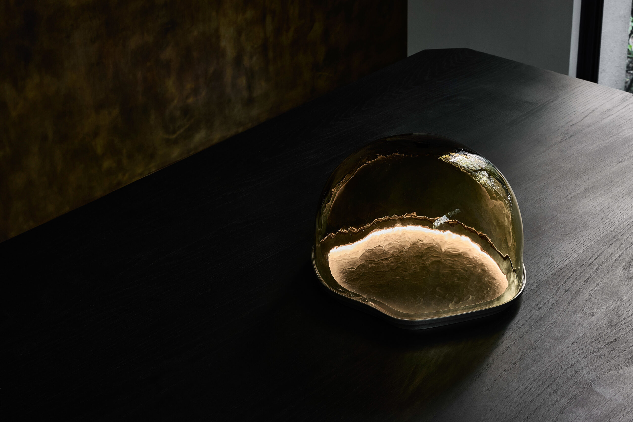 Cada pieza nace a partir de moldes de piedra volcánica, tallados a mano por canteros locales, y cobra vida gracias a la experiencia de Nouvel Studio. En el interior de cada forma de vidrio, una superficie metálica martillada a mano refleja la luz y la textura, amplificando las variaciones naturales del vidrio soplado.
