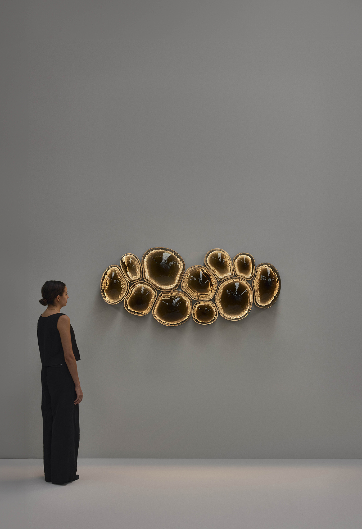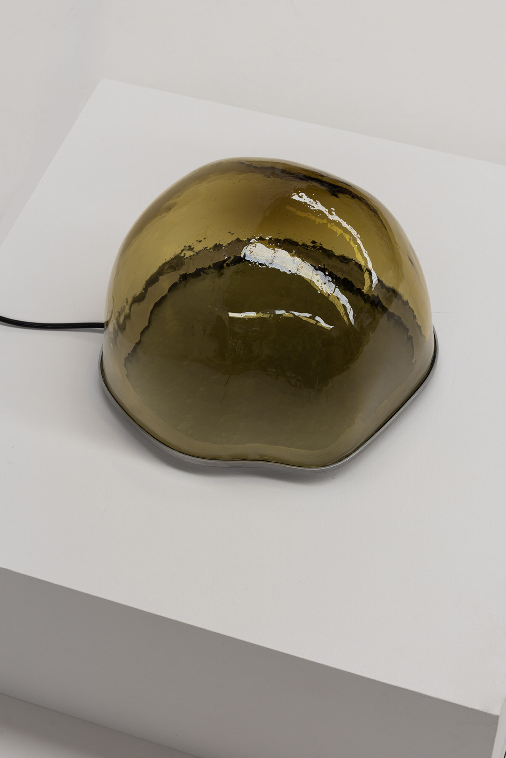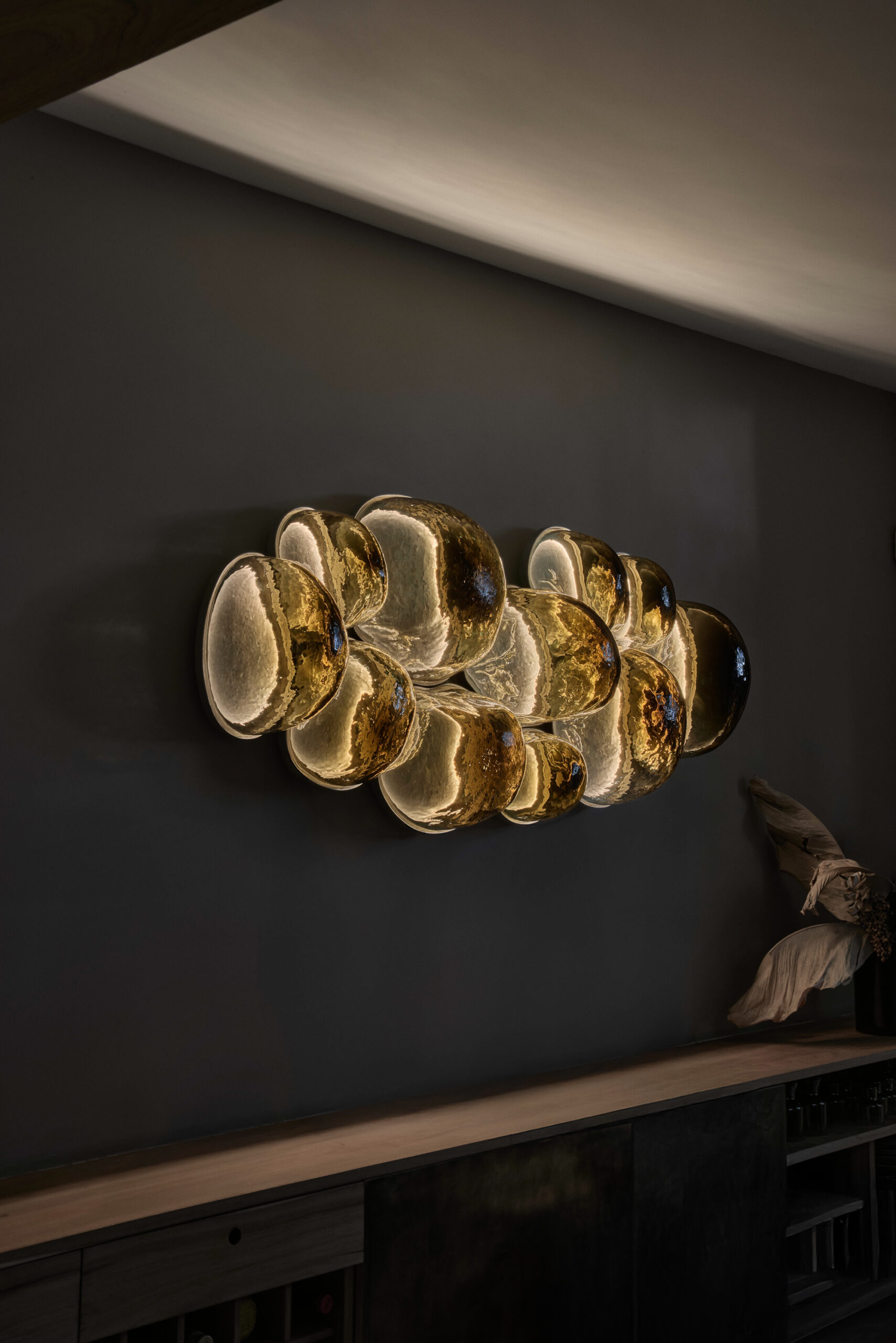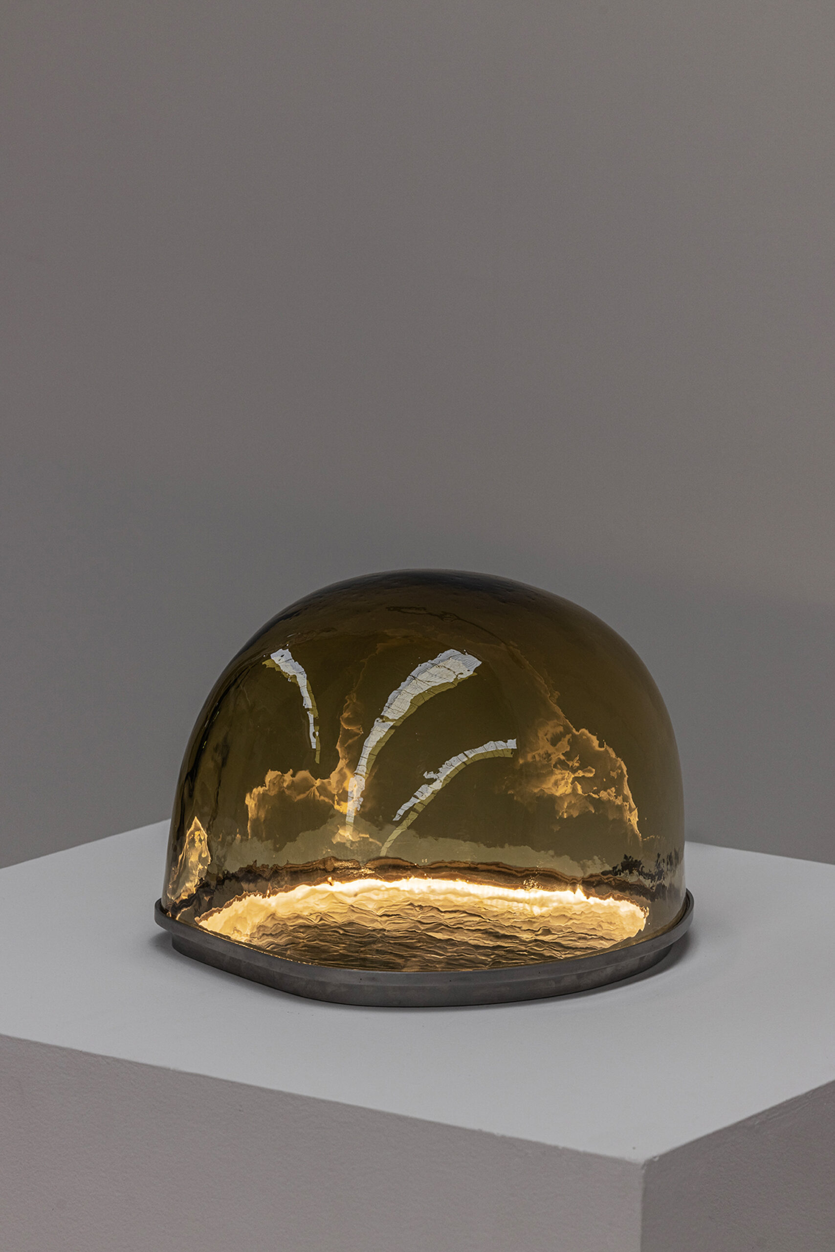 Cada pieza nace a partir de moldes de piedra volcánica, tallados a mano por canteros locales, y cobra vida gracias a la experiencia de Nouvel Studio. En el interior de cada forma de vidrio, una superficie metálica martillada a mano refleja la luz y la textura, amplificando las variaciones naturales del vidrio soplado.