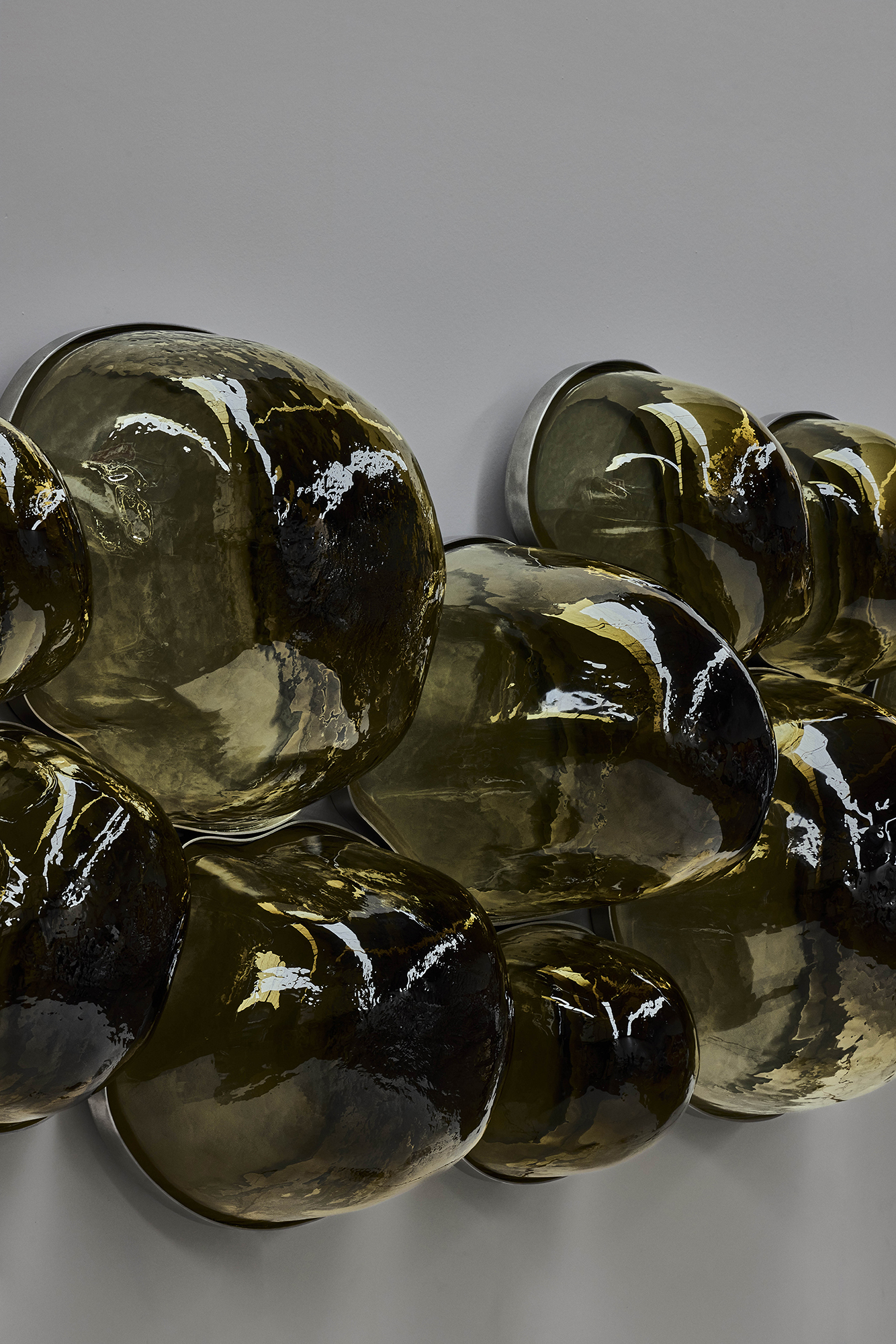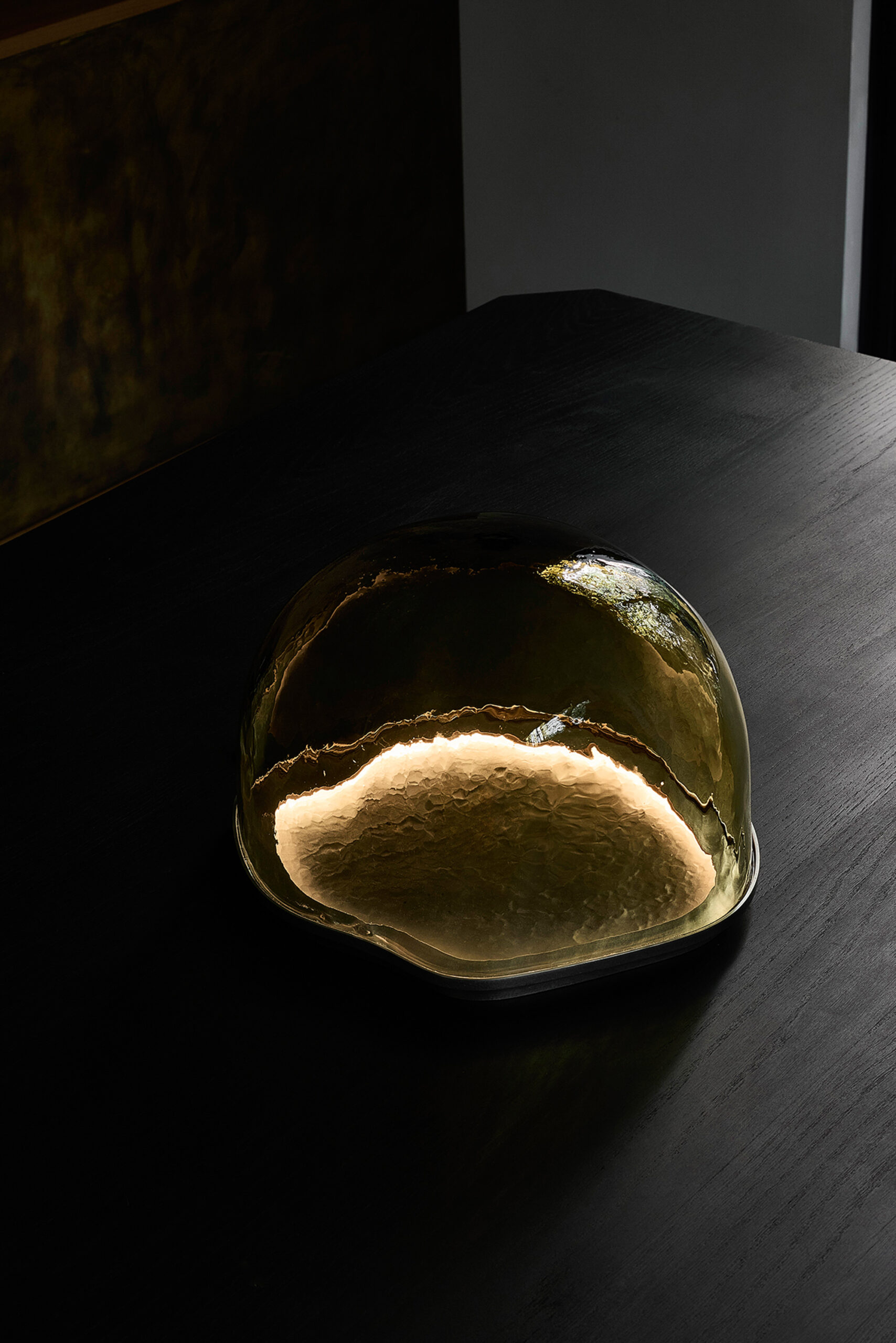 Parte de la Colección Alquimia, la serie Magma celebra el fuego como una fuerza transformadora—una que fusiona elementos, técnicas y disciplinas artesanales. Los nuevos tonos verdes de las luminarias continúan el diálogo entre la artesanía del metal y la del vidrio.