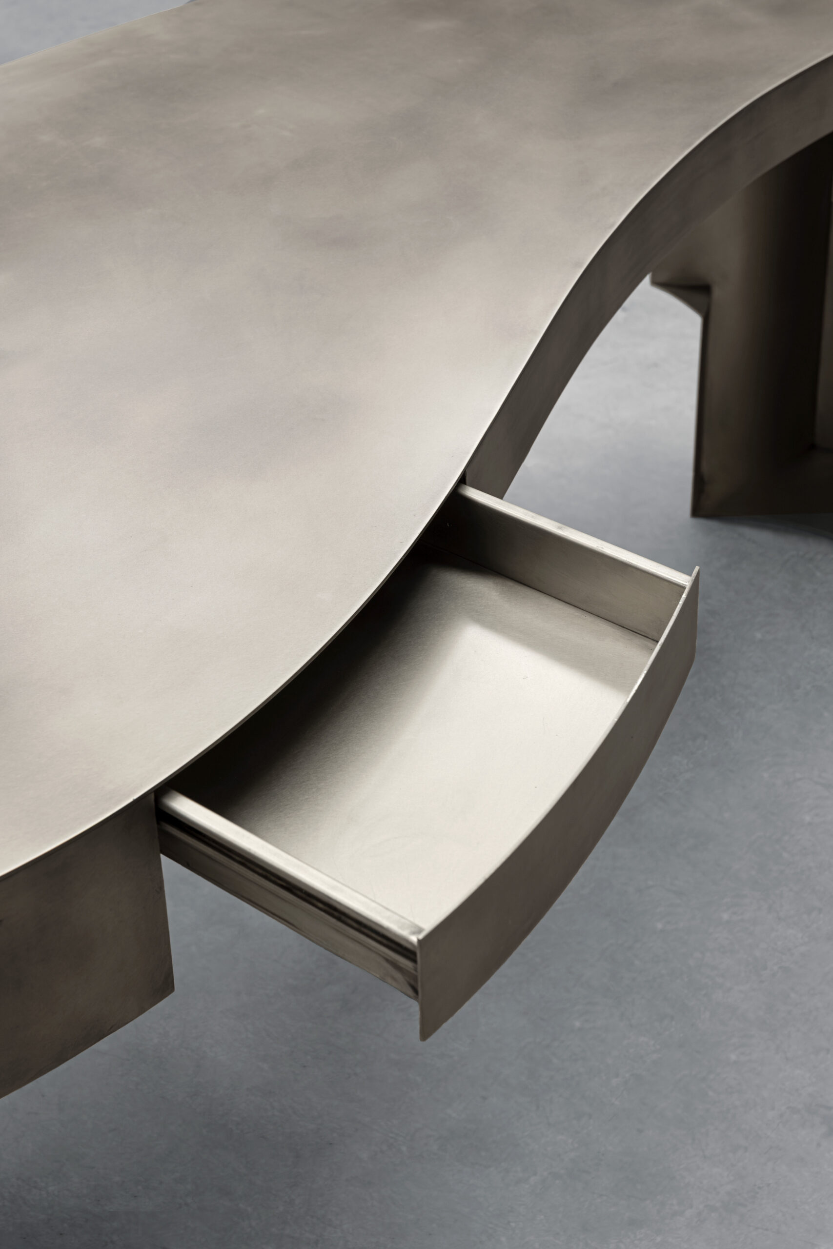 El escritorio Táas está construido con latón patinado, cuyas curvaturas ofrecen una combinación entre lo enigmático y lo funcional. Inspirado en los escalones arquitectónicos y columnas de las construcciones mesoamericanas, la geometría de la pieza está formada por superficies metálicas plegadas. En una alusión directa al acto de perforar o cortar, las hojas de metal se han transformado en una entidad escultórica que vincula las prácticas tradicionales de la metalurgia con una expresión de diseño contemporáneo.