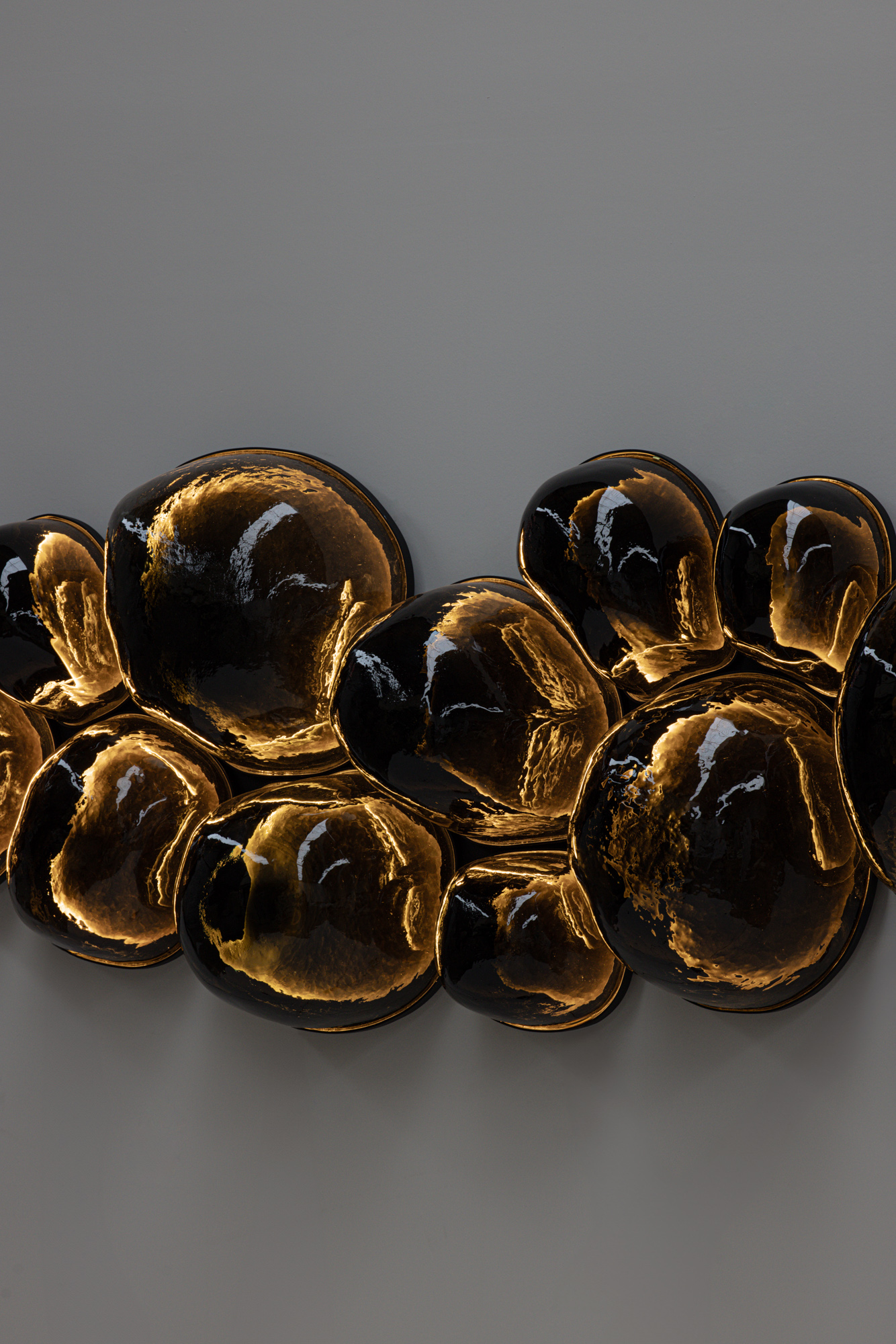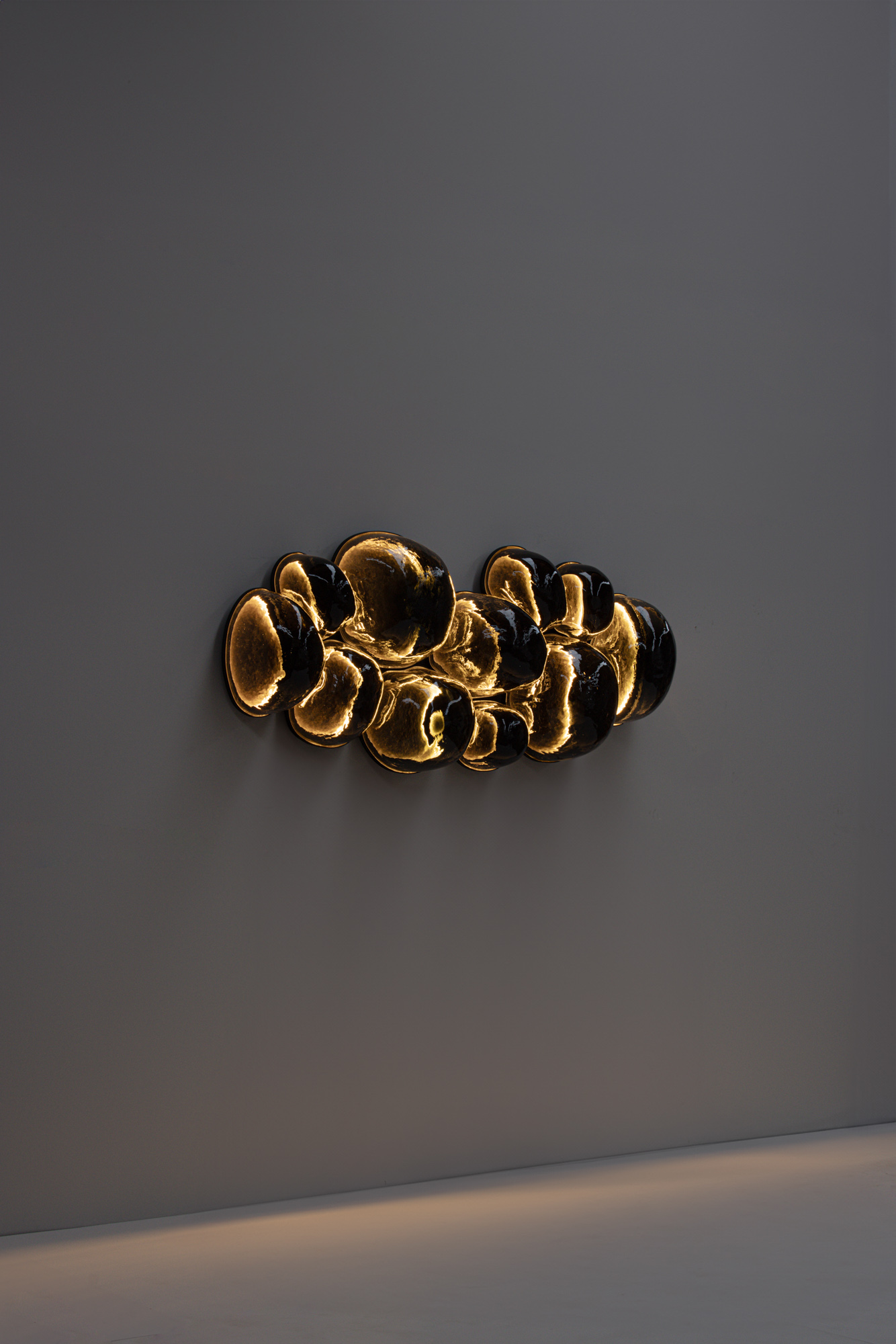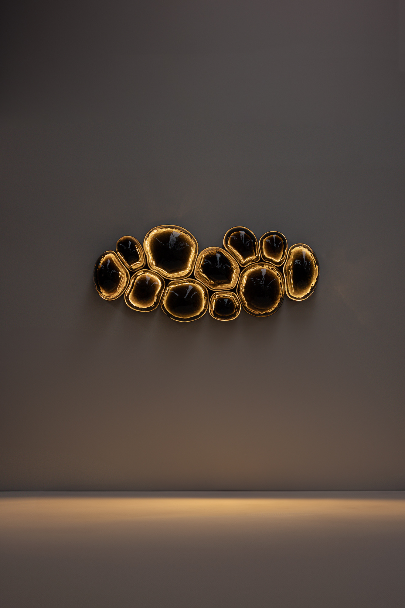 EWE Studio diseñó las lámparas Magma y las produjo en colaboración con Nouvel Studio. El proceso comienza con moldes tallados a mano en piedra volcánica por canteros locales, elegidos por su capacidad para soportar el intenso calor de la soplada de vidrio. Cada burbuja se sopla a mano dentro de estos moldes, lo que da como resultado variaciones en la forma, el grosor y el carácter de cada pieza. La estructura de acero que sostiene cada burbuja es hecha a medida para ajustarse a su forma única. En su interior, una superficie metálica martillada a mano crea reflejos, realzando el resplandor orgánico de las piezas.