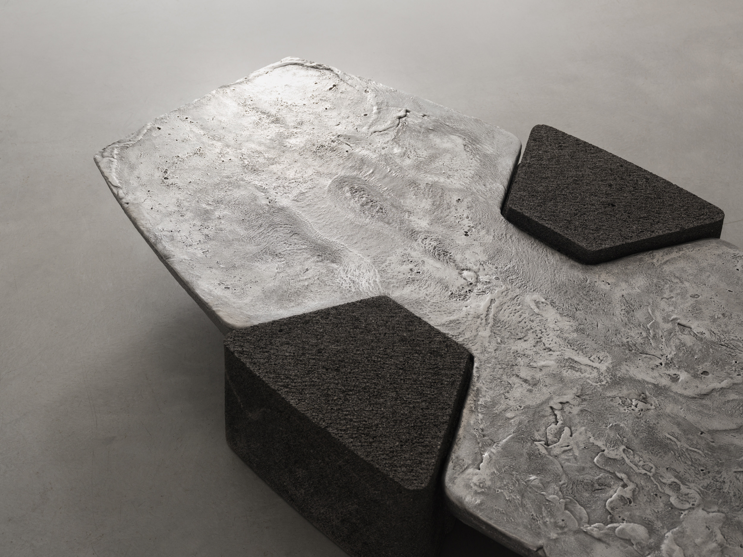 La mesa de centro Exhuma juega con el equilibrio entre la superficie prístina del metal fundido y la textura cruda de la piedra volcánica. Apoyada firmemente sobre su base tallada en piedra, la pieza alude a los objetos sagrados prehispánicos a través de su intrincado ensamblaje.