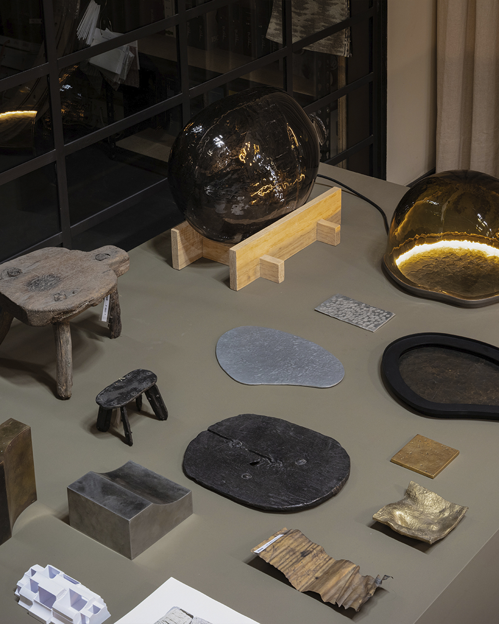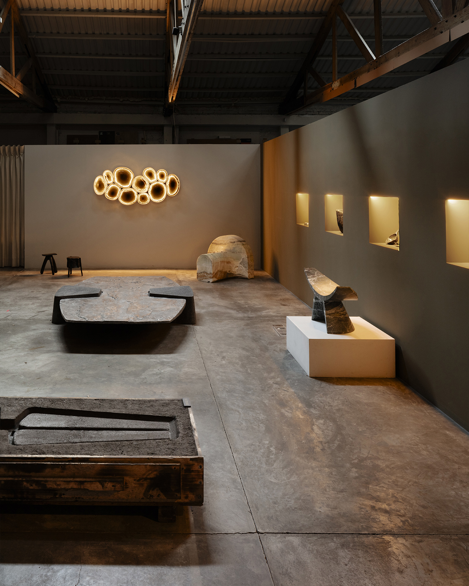 The presentation included the Símbolo Short in green onyx alongside its most recent iteration, the Símbolo Side Table in amber onyx; two of our iconic Memoria Stools; a coffee table from our latest collection, Exhuma; and a Partera Stool crafted in Tikal green marble, which sat in dialogue with our newest additions, the green Magmas.