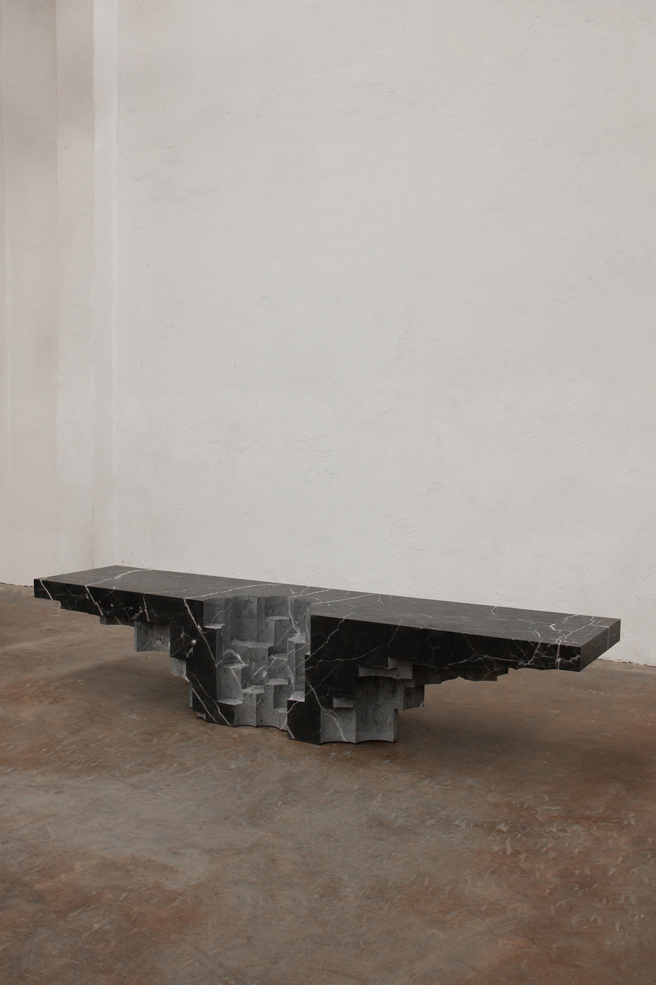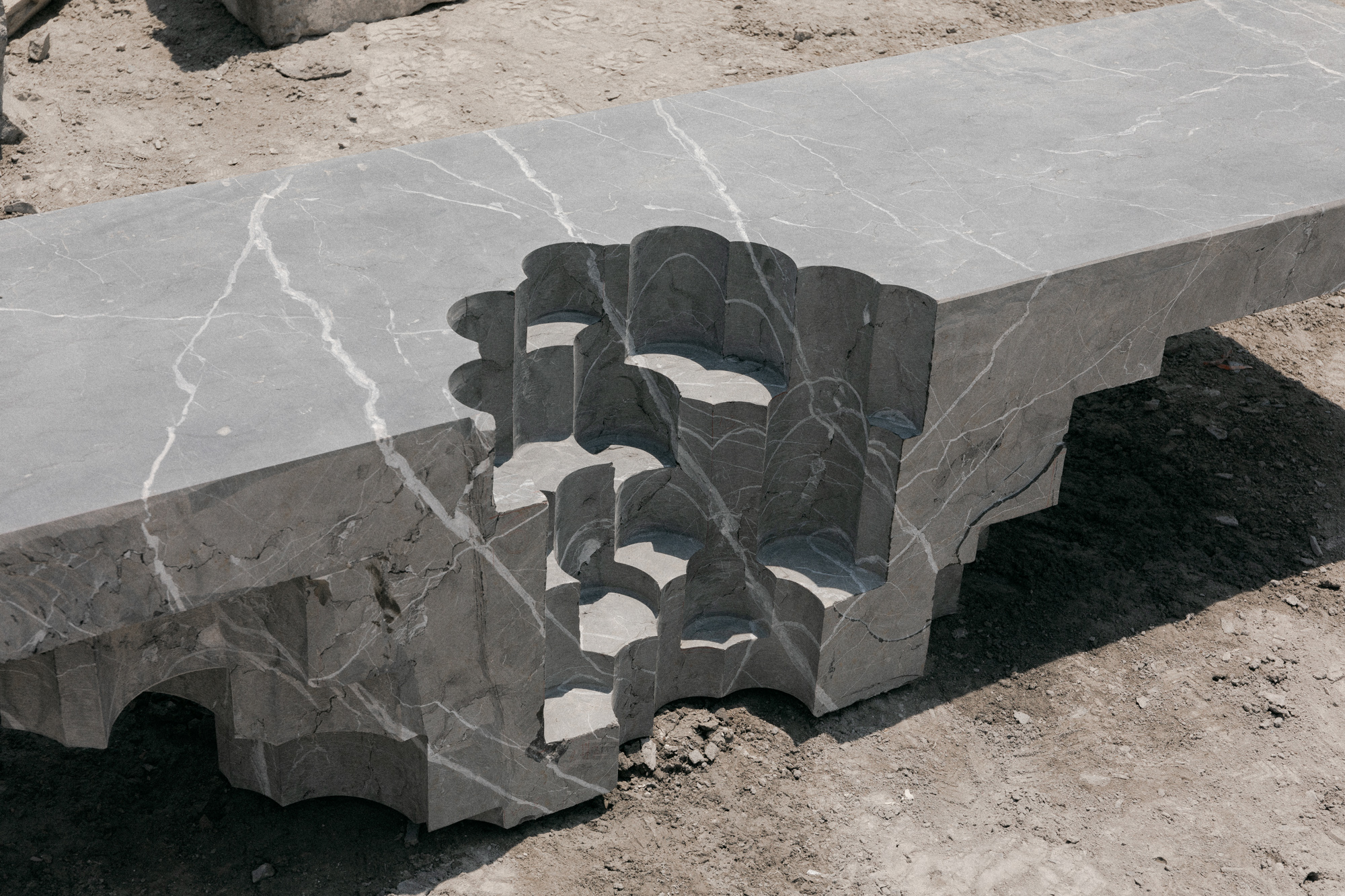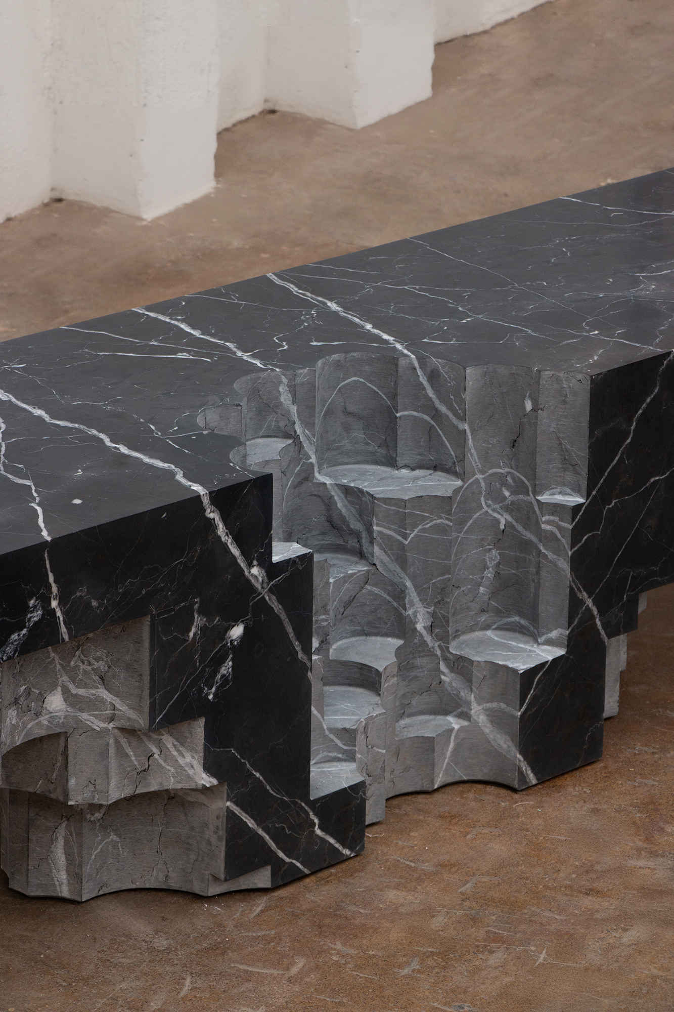 In particular, the Altar Bench is crafted through a process of subtraction and removal, sculpting its form with a delicate balance of shape and function. Precision drills are used to demark the seating area while simultaneously giving a sculptural quality to the work.