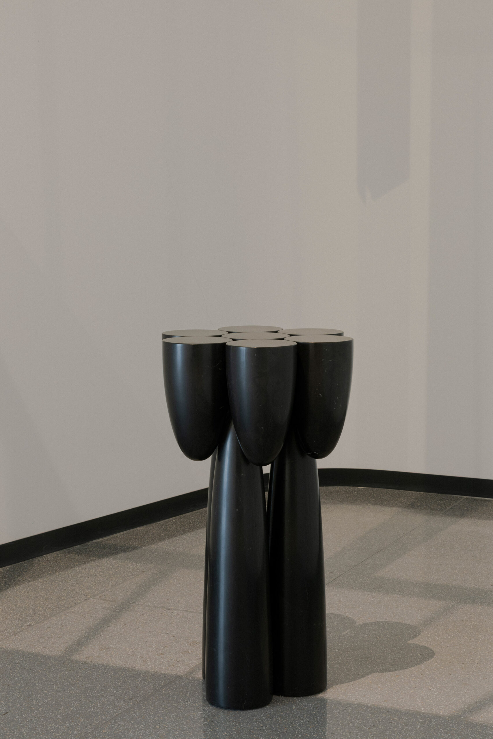 The pedestal, made out of Orizaba Black marble, achieves its balance through understanding the tangential connection of its parts and the hidden elements that allow them to be assembled together. The striking and simple expression of the piece creates a sense of purity and balance in a mystical and profound way.