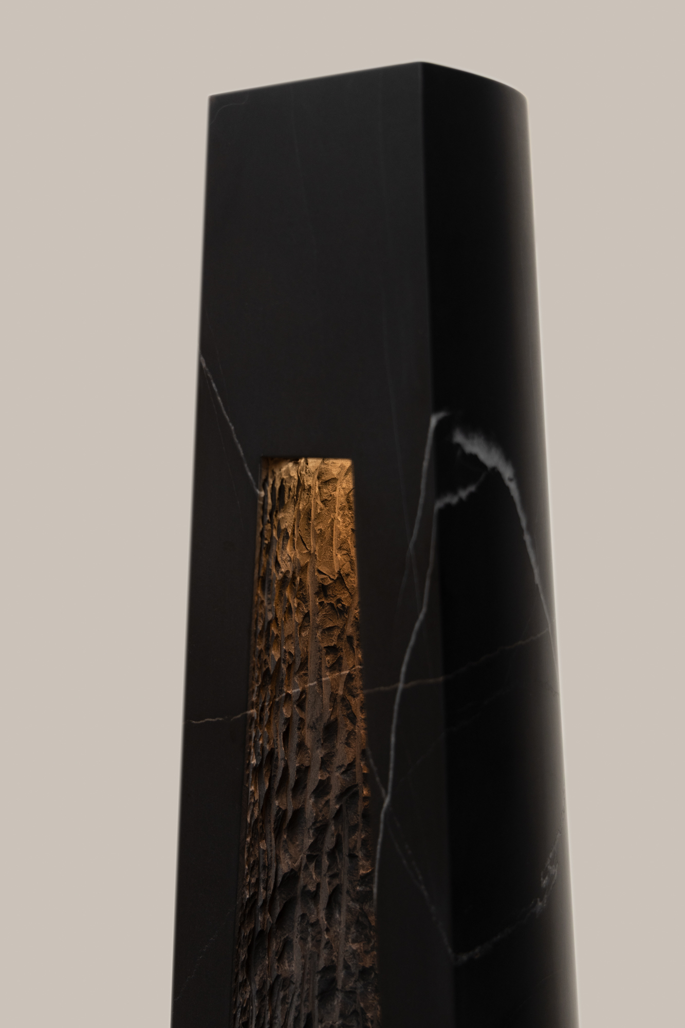Sculpted with exceptional precision, the Estela lighting sculpture stands as an elongated monolith, almost solemn in its presence. The challenge of sourcing such long, flawless stone blocks ensures each lamp is a singular work of craftsmanship.